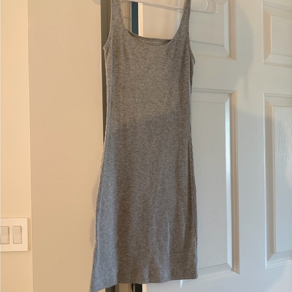 Stylish gray mini dress with ribbed texture. Sleeveless design for a modern look. Ideal for casual outings.