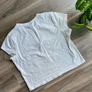 Keywords/Tags: graphic crop tee, botanical print shirt, minimalist aesthetic, casual streetwear, soft cotton tee, Y2K inspired, eco-style look, Divided H&M, lounge fashion, white summer top, trendy crop shirt