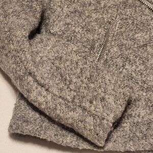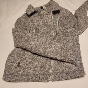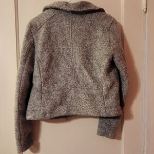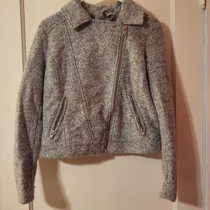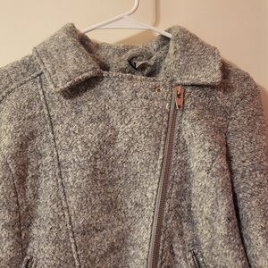 Divided by H&M wool blend gray jacket Size US Womens 10 Moto style with asymmetrical front zip See photos for measurements Fair used condition, some overall wear to fabric, in particular some fuzziness under the arms. No stains or holes.