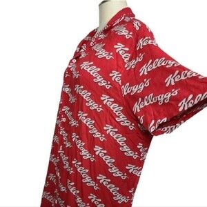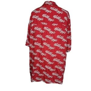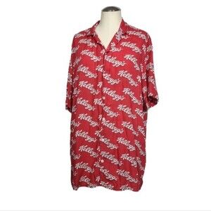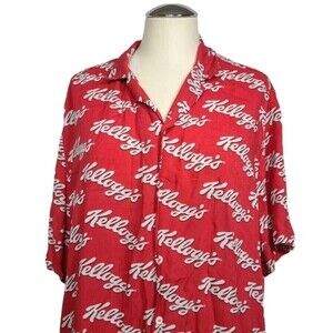 Divided shirt, button down, red with Kelloggs spelled out in white throughout shirt, there's some loose thread/stitching under the collar, not visible when worn, close up picture provided, size XL.