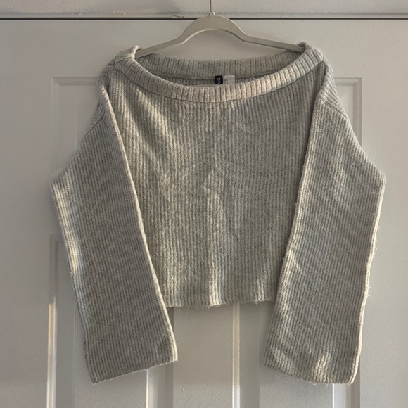Light gray ribbed sweater with a crew neck. Soft and comfortable for everyday wear.