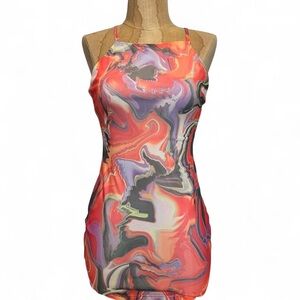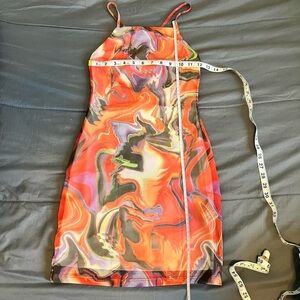 Eye-catching dress with a vibrant marble swirl pattern. Features a mix of orange, purple, and black colors.