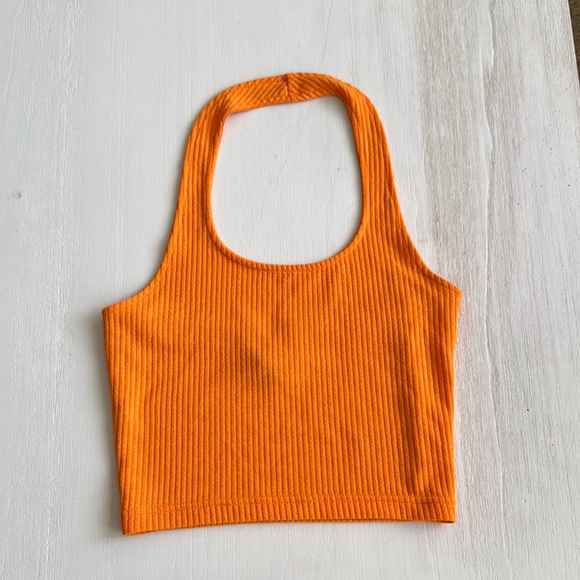 Vibrant orange halter top. Ribbed texture. Sleeveless design. Perfect for casual wear.