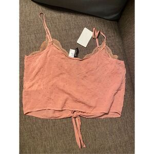 Chic pink top with button-front design. Features delicate straps and tie detail. Perfect for casual outings.