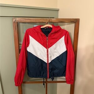 Stylish puffer jacket with a bold color-block design. Features a hood and drawstring hem. Perfect for casual wear.