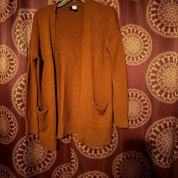 Chic rust cardigan with open front. Ideal for layering. Adds warmth and style.