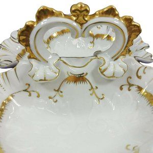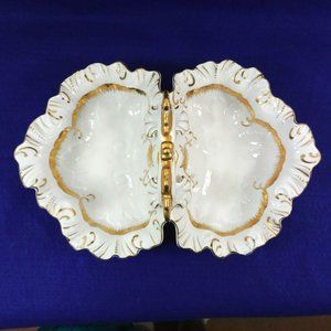 This is an Antique Divided Serving Dish w/ Center Handle Stamped #7608 Bright Gold Trim