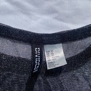 This is a sheer (would match cute with a black bra underneath) black sparkly shirt. Lightly used. XS but stretchy so I would say it would fit someone who’s a small too! Perfect for going out on the town type of shirt.