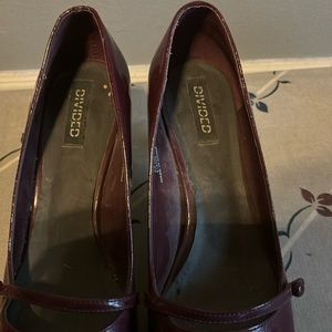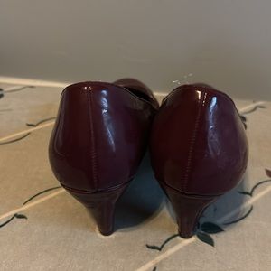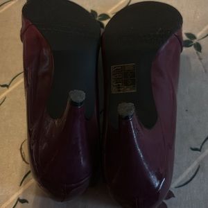 Beautiful wine red heeled shoes with elegant button detail. Does have some wear as shown in pics. Great to wear on an evening out