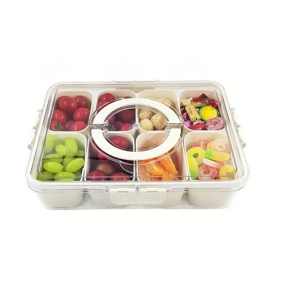 Keep snacks fresh, organized, and easy to serve with this large, divided snack tray with lid and convenient carry handle. Ideal for entertaining or everyday use, this multi-compartment storage box spins for quick access to your favorite treats. Great for nuts, candies, dried fruit, veggies, chips, and more!