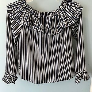 Divided Brand- trendy and classy in one top! Optional off the shoulder look or classic ruffle neckline. Looks great with a pair of jeans and a bold red bag and shoes! Excellent condition.