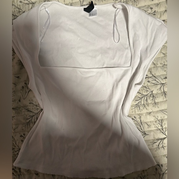 Chic white blouse with ribbed texture. Square neckline and cap sleeves. Perfect for casual or dressy looks.