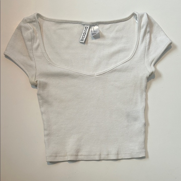 Trendy white ribbed crop top. Short sleeves and scoop neckline. Ideal for casual wear.