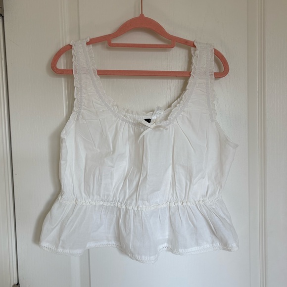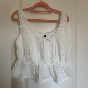 Chic white blouse with ruffle accents. Sleeveless design. Ideal for casual outings.