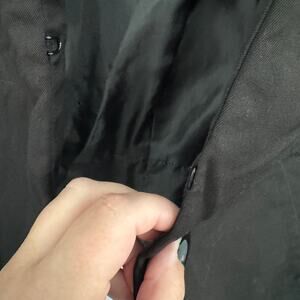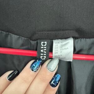Divided by H&M Black Cropped Blazer Jacket in women's Size 12. Long Sleeves. One hook and eye type Front Closure. Jacket is in good used condition with no flaws or stains other than some minor wash wear. Pit to pit measures approx 18.75 in across & length from top of front shoulder to bottom hem measures approx 21 in. Slightly cropped style. Business casual. Office wear. Work wear. Career. Please see close-up pictures for condition details. Back has a peplum hem.