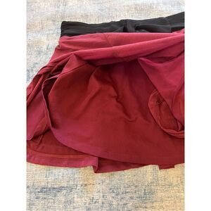 Very cute burgundy skirt with a large bow and black waist. Double layered. Top layer is semi sheer. Back zip. Good condition, but the top layer does have a couple of snags. Hard to see unless you get up real close. Please see last photo for reference.