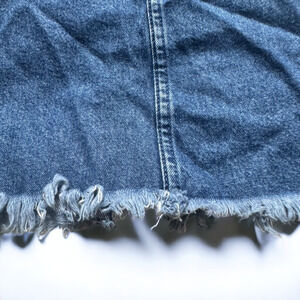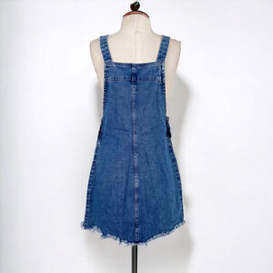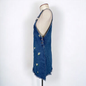 Adorable blue denim overall dress by Divided by H&M featuring white and yellow mini-flowers, button up snaps at the sides, a distressed hemline, and adjustable straps.