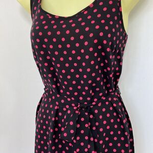 BY DIVIDED FOR H&M, HERE IS AN ADORABLE SLIP OVER TANK DRESS. LOOSE AND FREE FLOWING, IT IS DONE IN BLACK WITH PINK POLKA DOTS OVER IT. IT FEATURES A SCOOP NECK AND BACK AND A MATCHING SEPARATE TIE BELT. IT CAN BE WORN LOOSELY OR WITH THE TIE FOR A WHOLE DIFFERENT LOOK. EXCELLENT CONDITION~ SIZE 8, PLEASE NOTE THE MEASUREMENTS