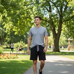 The product is a pair of Divided by H&M Men's Sweat Shorts in black with an elastic waist, suitable for casual occasions. These shorts are made of a blend of polyester and cotton, featuring a solid pattern, drawstring closure, and a mid-rise fit. The design includes a flat front, slash pockets, and are machine washable. Perfect for the summer, fall, and spring seasons, these shorts have a beach, American, and outdoor theme, making them a versatile addition to any man's wardrobe.