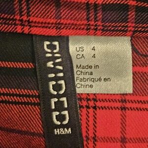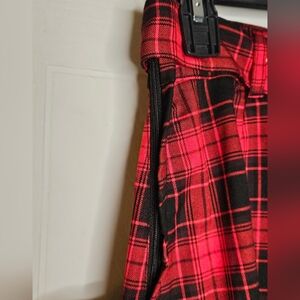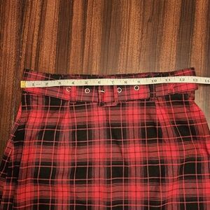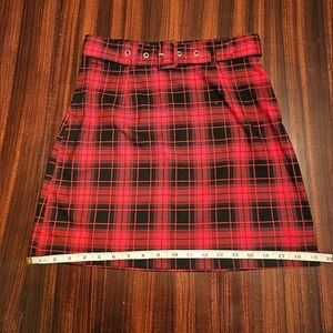 Red and black plaid mini skirt, zip and button closure, zipper is on the side. Belted. Excellent used condition.