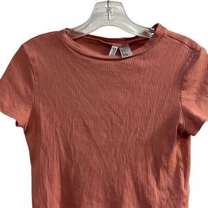 Keywords: Divided by H&M, cropped top, medium, mauve, women's clothing, casual wear, spring fashion, ribbed fabric, short sleeve, fitted style, cotton blend, machine washable, pre-owned, excellent condition.