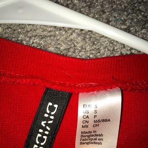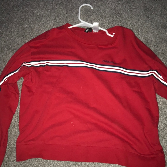 Red shirt with blue and white stripe with the word original, worn but not noticeably