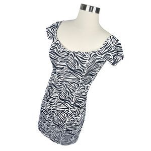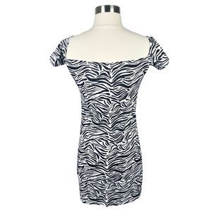 Zebra print mini bodycon dress, capped/off-the-shoulder short sleeves, sweetheart neckline (cinched), pullover style