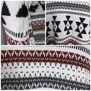 Divided Aztec Open Front Wool Blend Cardigan Sz M. Missing the belt but you could add your own or wear without. More of a cream than a white. Black, brick red and gray accents. Light wool blend that's soft and non itchy. It's oversized as well. Please see pictures for details condition and measurements to ensure proper fit. Thanks for looking!