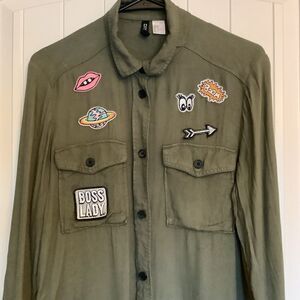 Love this adorable button down with various sewn on colorful embroidered patches. 100% viscose. Slightly oversized. Size 8