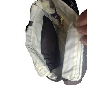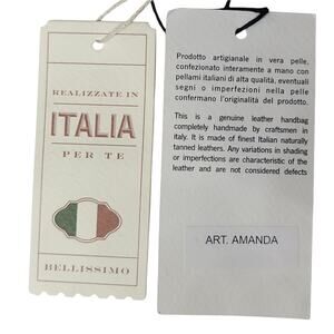Compact: approx 8" H × 5½" W. Adjustable/removable strap, exterior snap pocket + zip main closure. Tags included; “Art. Amanda”. Perfect for phone, wallet, travel essentials.