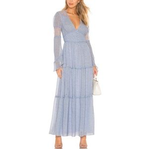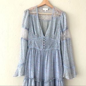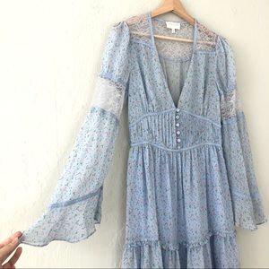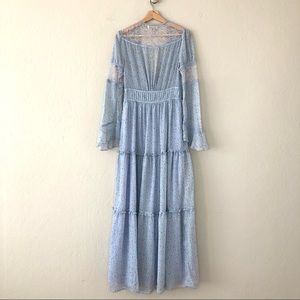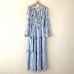 Gorgeous light blue maxi dress with a dainty floral pattern, lace details and a tiered maxi hem. Decorative front buttoning, slightly puffed shoulders, flared sleeves, sheer lace panels on back and sleeves, fitted waist, invisible zipper closure. Made of very soft flowy polyester chiffon, lined.
