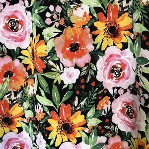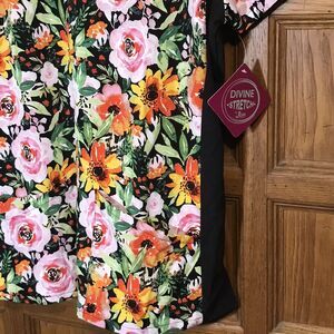 Divine Stretch Top Women's size Large, Multicolor Floral with Black side panels. 97% Polyester - 3 % Spandex Blend Scrubs. 3 Pocket, Short Sleeve, V-Neck Scrubs.