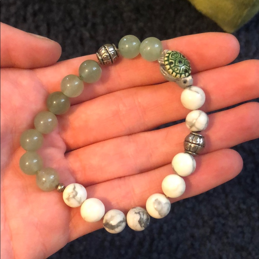 white and green beaded turtle bracelet. It’s a little stretched out, but still in good shape!