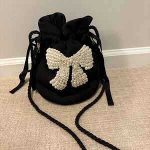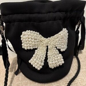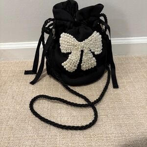 Dixie Black Beaded Bow Bucket Bag Evening Party Purse Drawstring Pearl Coquette