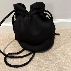 Chic evening accessory, a drawstring bucket bag crafted in sleek black fabric features an elegant pearl-beaded bow on its front. This petite purse has a soft, gathered top that cinches closed with a drawstring, which can be adjusted to create a ruched effect. It is suspended from a slim, twisted rope shoulder strap. The bag also has an additional set of flat fabric straps that hang from the sides. Inside, the interior is lined with smooth fabric, completing the sophisticated design.