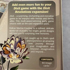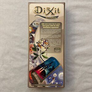 This is Dixit Revelations, which is an expansion set for the board game Dixit. This is an expansion, so you will need the main board game Dixit to play, it is not included. The expansion is 100% complete and includes all 84 cards, and is overall in Good Condition. 42 of the cards are loose and they are in fantastic condition. The other 42 cards are still factory sealed in the original packaging, so they are in fantastic shape as well. The box is in good shape, with a few minor corner wear marks to the corners of the top and bottom of the box. These flaws are shown in the photos. Other than that, everything is in great shape. It comes from a smoke free and pet free home and will be packaged and shipped with great care.