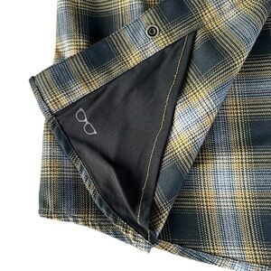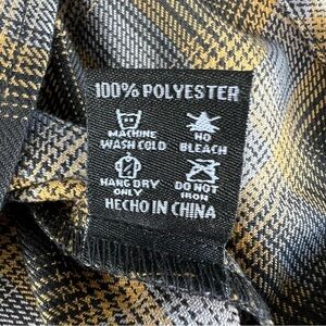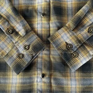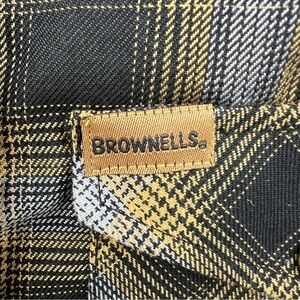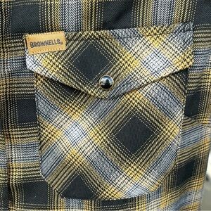 Dixxon Brownells Big Iron Plaid Pearl Snap Shirt. Women’s size medium. Gold and Black with Black Pearl snap buttons. Excellent preowned condition. I’m not sure this was ever worn.
