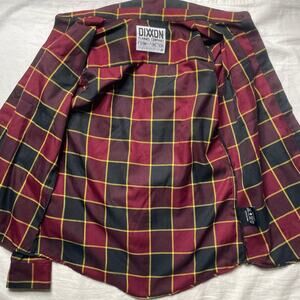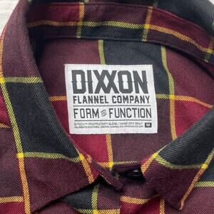 Dixxon flannel shirt in a black and red plaid pattern, size medium. Features a full button up closure, button sleeve cuffs, and flap chest pockets. Good preowned condition, no notable flaws.