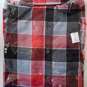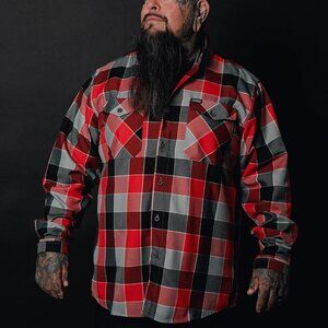 Men’s red, black, gray, and white plaid patterned flannel shirt