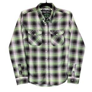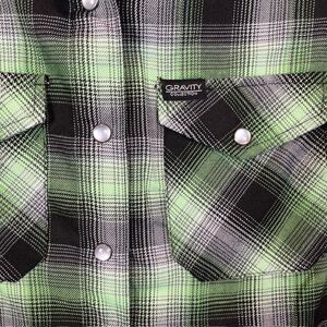 Gravity Flannel Company Gravity Energy Green Black Plaid Pearl Snap Size Medium. Like new! See photos for details and measurements. Gravity Coffee Energy. pearl snaps, branded buttons on cuffs, lightweight flannel, gravity coffee limited edition, gravity energy, dixxon flannel company, dixxon energy gravity, goth, skater, moto shirt, biker, motorcycle, bmx, bike life, shredder