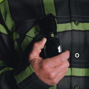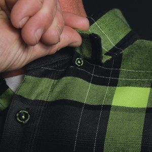 Men’s black and green plaid patterned flannel shirt that glows under black light