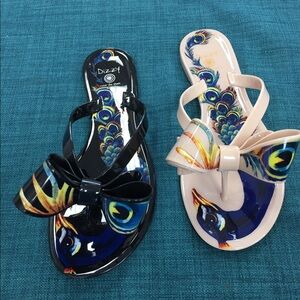 Stylish sandals with a bold bow design. Features vibrant artwork on the sole. Perfect for casual wear.