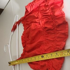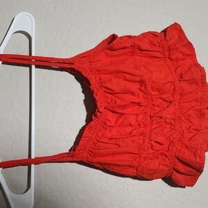 Chic and vibrant red ish orange sleeveless top with ruffle details. Perfect for a stylish and comfortable look.