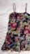 Shell: 100% polyester. Lining: 100% cotton. Made in India. RN. #69654. Machine wash cold with like colors, delicate cycle. Do not bleach. Tumble dry low. Warm iron. Some imperfections in the fabric. Adjustable spaghetti straps. Dress is a vibrant floral pattern. Black lining underneath semi sheer floral patterned fabric. Ruffle accent detail at the bottom of the dress.