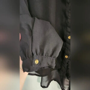 100% polyester, v-neck, gold buttons, long sleeves, cut outs in the back, high low hem