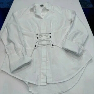 Excellent condition. Unique and stylish Women’s white button down shirt with a corset lace up waist and elastic back. Hidden button front. Long sleeves. Size small. See photos for measurements MSRP $140