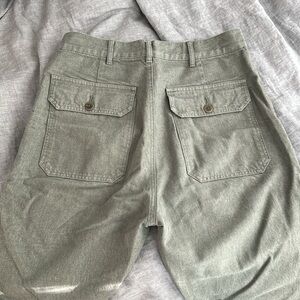Our Go To Pants have a loose, straight fit and are made from a thick cotton fabric. They have two front pockets and two in the back with button fastenings and stitching details.