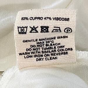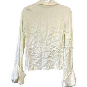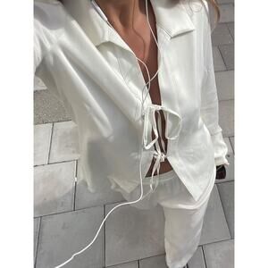 Djerf Avenue Occasion Top in Cloud. Size XS / Extra Small. Features long sleeves with oversized cuffs, collared, two tie closures at front, silky cupro fabrication, relaxed fit. 53% cupro, 47% viscose. Excellent condition, no flaws.