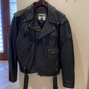 This black bomber jacket by Dkny features a striking graphic design on the back with gold lettering and a colorful floral motif. Made from leather, it offers a smooth and glossy finish, perfect for a stylish look.