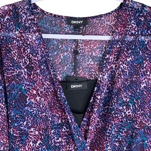 Dkny Leopard Print Tie Waist Drawstring Satin Blouse Safari Purple-Teal& Black
